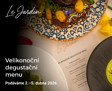 Cestou do restaurace procházíte dvorem, který se s příchodem jara promění v letní zahradu. Zdi porostlé psím vínem a řada drobných světýlek navěšených nad hlavami vytvářejí atmosféru, ve které se dobře zůstává i po západu slunce. Restaurance i s terasou a lounge pojme až 56 hostů. Přesto zůstává Le Jardin stále tím, čím má být: tichým místem, kde si i ve větší společnosti můžete dopřát prostor pouze pro sebe.
